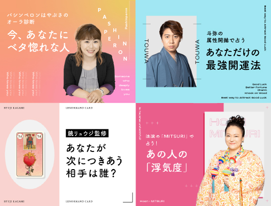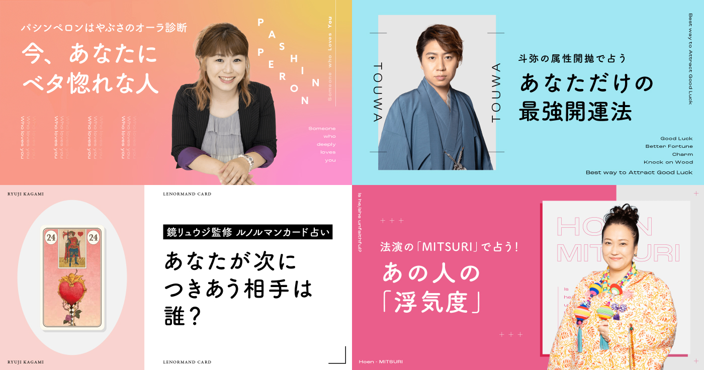 TVやSNSで話題の占い師の占いがすべて買い切りで楽しめます。一部無料の占いもあるので、気になる占い是非チェックしてみてくださいね。
