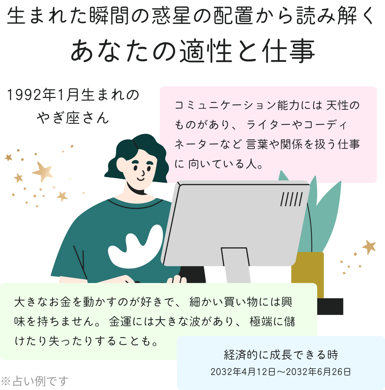 あなたが生まれた瞬間のホロスコープから、適性や才能、お仕事やお金にまつわることを、石井ゆかりさんが読み解きます。